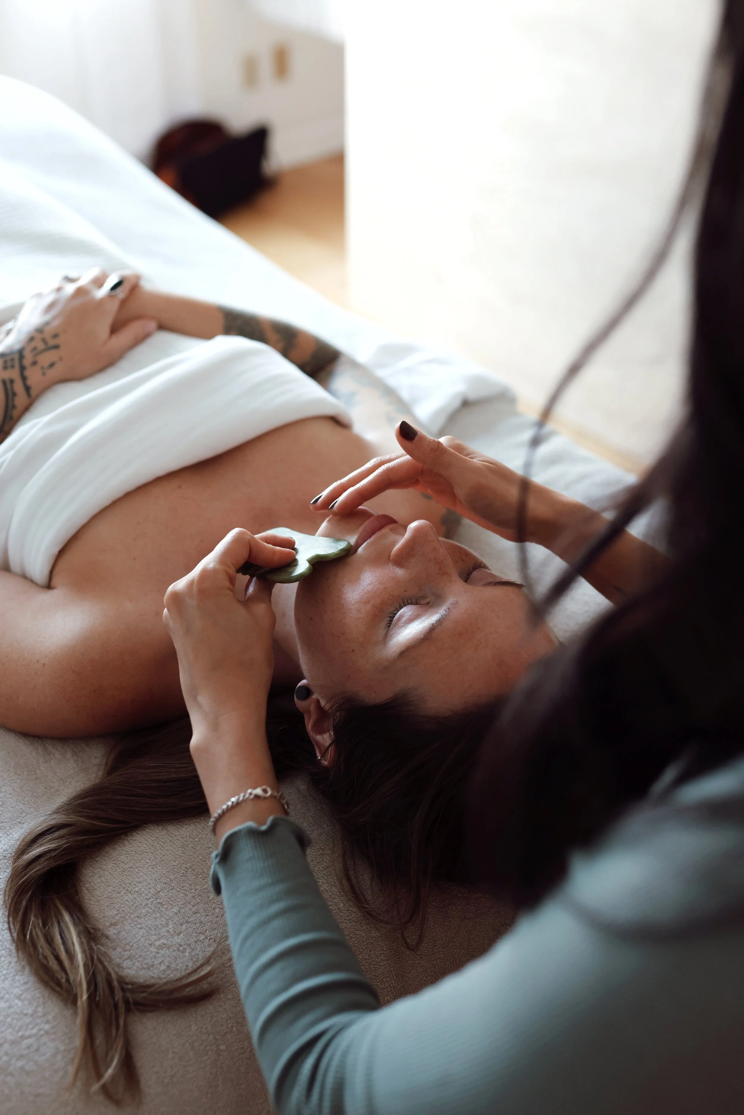 Gua Sha - directly translates to ‘scrape, sand’. And while we won't be scraping, or breaking up stagnant blood like we would on the body - we are going to tend to the facial muscles, and help bring lift and vitality to the skin. This hour long juicy session melts down jaw tension, sinus pressure, lifts tired eyes, and so much more. Both energetically and manually, this facial of sorts is designed to tenderly reduce inflammation and soothe the nervous system.